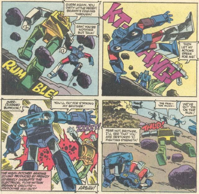 Autobot Brawn faces Decepticons Rumble and Frenzy in Marvel's Transformers comics.