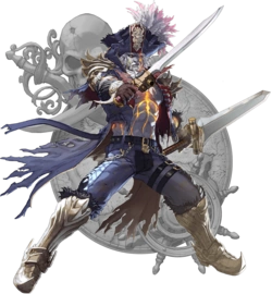 During development, several designs were considered for Cervantes, with the initial concept appearing as a clean-shaven man with long hair tied in a pony tail and a raised-collar coat. This and several subsequent designs were eventually rejected, however, as the development team felt they were either too reminiscent of nihilistic pirates or gentlemanly in appearance. Taking a different approach, they designed his appearance as a tall male with a trim mustauche and white hair extending to the base of his neck. A blue coat with an extended tail covered his upper body, with thick gloves extending past his wrist and a large hat covers his head. White pants cover his lower legs, surrounded but leather armor on his upper thighs, and armor plating covering his lower legs and upper chest, with a neck scarf resting atop the breastplate. His design was intended to orient the viewer's eye towards his left, with his hat angled in the opposite direction.[6]