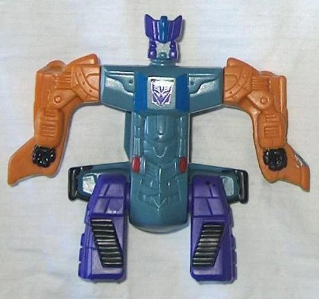 - A simplified version of the Cybertron Megatron figure available only at Burger King restaurants, which transforms only into jet mode. The picture on the left actually has paint applications added onto it that are not official: the legs have black added onto the vents, the fists are painted black, the wings are tipped with black, there is red added to the waist, there is a decepticon symbol added onto the chest with blue on the sides, and there is blue added to the forehead.