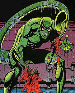 Mac Gargan was a private investigator initially hired by J. Jonah Jameson to find out how Peter Parker is able to obtain incredible pictures of Spider-Man.[5] Gargan's efforts set off Peter's spider-sense and the teen was able to easily evade the detective. Jameson then decided to hire Gargan as the subject of a barely tested process that would endow him with the useful characteristics of a particular animal with the help of Dr. Farley Stillwell. In this case, a scorpion was the base for the purposes of creating a powerful agent capable of defeating Spider-Man. The Scorpion proved to be more than a match for the wall-crawler, defeating him twice, but the mutagenic treatment seriously affected Gargan's mind, driving him insane. He promptly turned on his benefactor but Spider-Man intervened, and managed to finally defeat the Scorpion in their third battle. Jameson was struck with the irony that he was saved by the man he tried to destroy from the thing he created to destroy him.[6] Since then, the Scorpion became a professional criminal and would return to indulge in his deadly vendetta against Spider-Man and Jameson, only to be defeated again.[7]