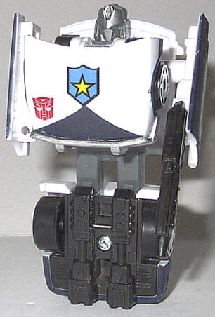 Prowl's logic center is unquestionably the most powerful of all the Autobots', giving him the ability to analyze any combat situation almost instantaneously and then advise on the optimal course of action - a skill that makes him eminently suited to his role as the Autobots' military strategist and analyst. For example, he can compute the paths of movement of 800 separate moving objects and determine the proper countermove in half a second. In robot mode, he is armed with a pair of shoulder-mounted cannons which fire wire-guided incendiary missiles, and a semi-automatic rifle that shoots pellets filled with a highly corrosive acid. He transforms into a police car version of a Datsun Fairlady 280ZX.[1][2]