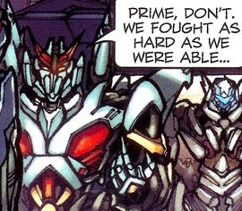- ↑ Jesse Wittenrich & Pete Sinclair (w), Robby Musso (p), Matt Frank (i), Thomas Deer (col), Jesse Wittenrich (let), Pete Sinclair (ed). "A Flash Forward Epilogue" The Transformers Collectors Club (September 2012), Fun Publications