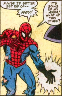 In Secret Wars #8 (December 1984), Spider-Man damages his costume in combat on Battleworld and is directed to a facility which can provide a new one to him. Before having the chance to recover a new suit, Spider-Man stumbles into the prison module the Symbiote has been trapped in. He then activates the machine which releases the Symbiote in the form of a black liquid. Spider-Man's "spider-sense" initially tingles, and then stops upon Spider-Man's first contact with the liquid; it covers his body and, reacting to Spider-Man's thoughts about the costume worn by the second Spider-Woman, forms a new costume and symbol. To Spider-Man's surprise, the costume can mimic street clothes and provides a seemingly inexhaustible and stronger supply of webbing.[10]