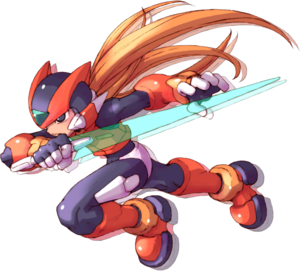 Designed to be "harder and wilder" than the original Mega Man, Zero's design ultimately resembled Mega Man X in several ways due to his initial character concept, Inafune's insistence on drawing the character, and input from other project artists.[7] In the X series, Zero has red and white armor with twin "horns" on his helmet. Zero also has his signature long blonde hair. His main weapon is the Z-saber, an energy-based sword that introduced melee combat to the Mega Man games. His secondary weapon is the Z-buster, a cannon mounted at the end of his right arm, similar to Mega Man X's primary weapon.[8] A tertiary weapon that would orbit around Zero was also considered, but left uncompleted. Unlike the original Mega Man, who had a full head of hair under his helmet, Zero has a smooth secondary helmet, intended to imply the characters were older.[7] In Mega Man X4, Zero was going receive his own enhanced armor in the same way X does, but the development team decided not to finish it.[9]
